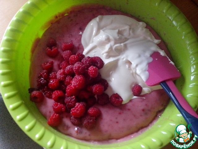 Теперь добавим сметану и оставшиеся ягоды малины. Перемешать.