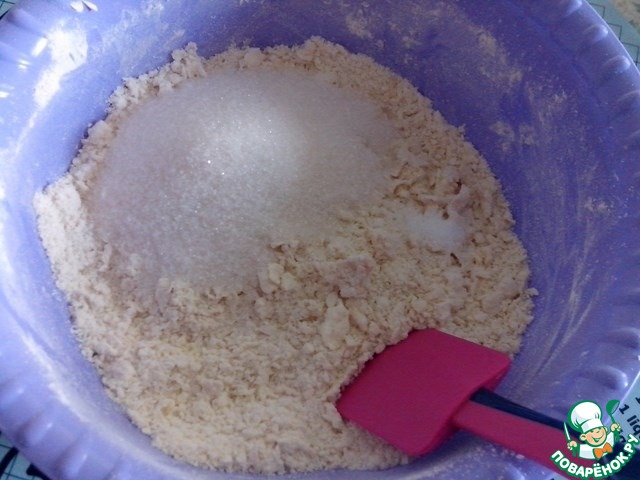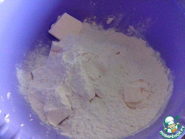 Приготовим песочное тесто. В просеянную муку добавить нарезанный на кубики маргарин, порубить ножом в крошку.