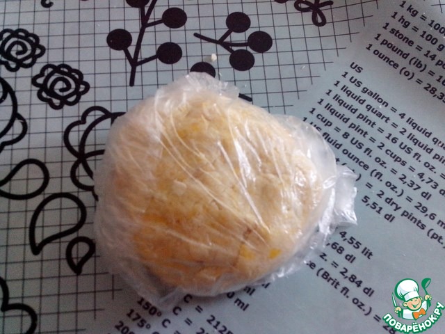 Быстро замесить тесто. Упаковать в пленку или целлофановый пакет и убрать в холодильник на 30-35 минут.