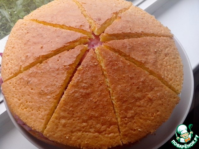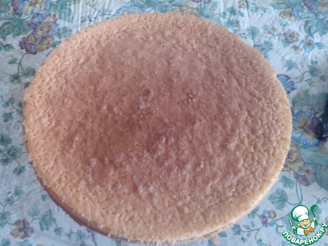 Достать из духовки бисквит, поставить остывать. Остывший бисквит разрезать на 2 коржа.