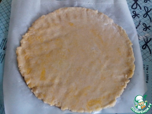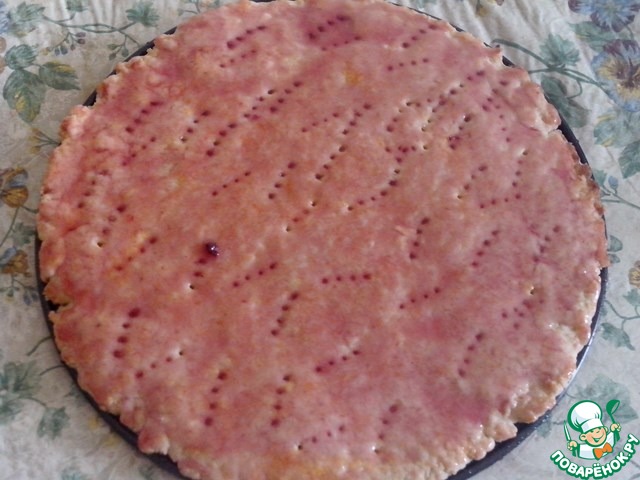 Песочное тесто достать из холодильника, раскатать на дне разъемной формы (d=28 см). Наколоть вилкой.