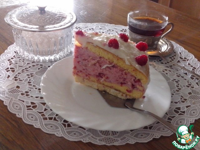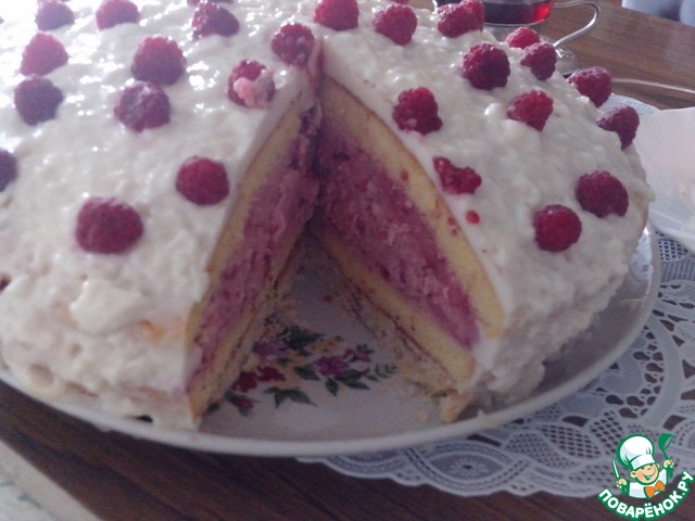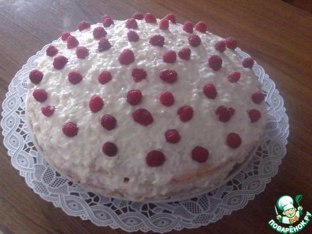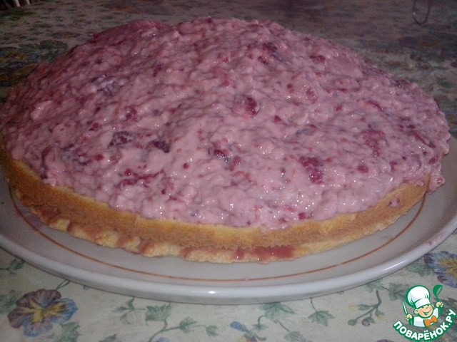 Когда масса начнет застывать-нанести на верхний корж. Украсить малиной. Торт на ночь поставить в холодильник, чтобы начинка окрепла.