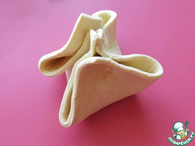 От теста отрезаем три полосочки по 1,5см. Остальное делим на три равные квадрата. На каждый квадрат кладём кусочек сыра и собираем тесто в "мешочек".