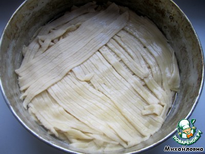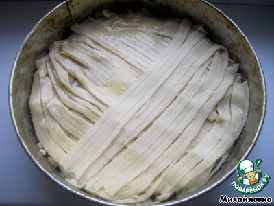 Далее один слой лапши, оставшаяся начинка и три слоя лапши. Не забываем промазывать растопленным маслом.