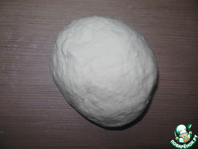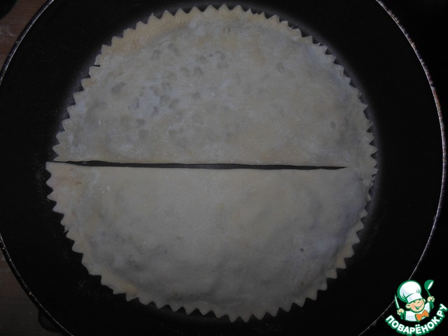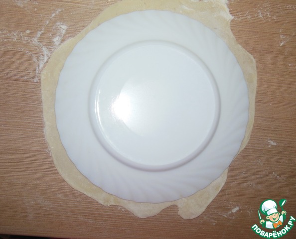 Тесто тонко раскатать, вырезать по большой круглой форме.
