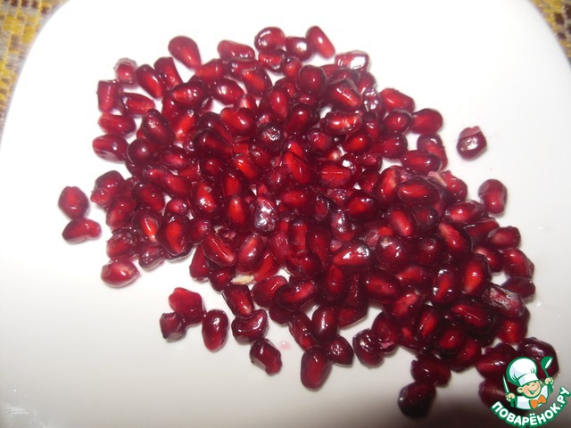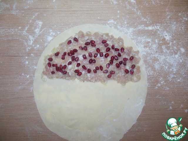 На половинку раскатанного теста выкладываем фарш, посыпаем его зёрнами граната. Ой, забыла написать про фарш. Фарш в кутабы кладут бараний, но, можно и говяжий. Его посолить, добавить чёрного перца и лука (на тёрку или вместе с мясом на мясорубку)