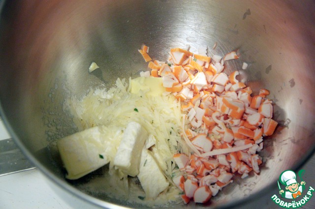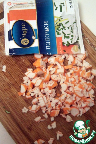 Мелко нарежьте крабовые палочки, они добавят печенью нежность и мягкость. Впервые готовила такой вариант, в котором используются крабовые палочки, скажу, что осталась невероятно довольна.