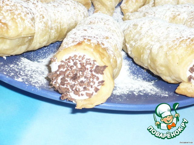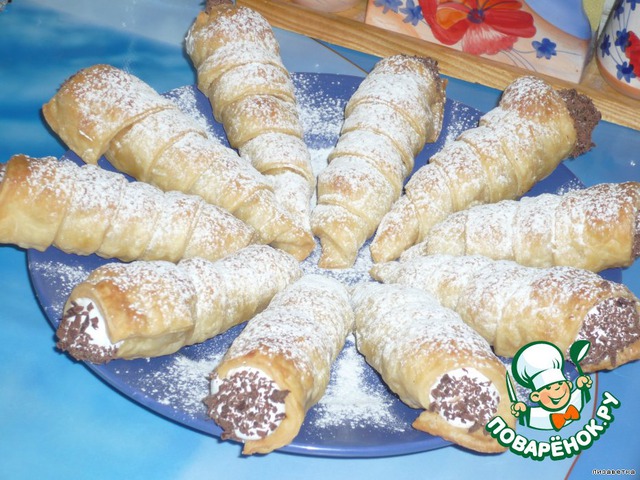 Тесто разморозить, раскатать, разделить на 10 полосок, смазать каждую раст.маслом. Накрутить на формочки. Выпекать 20-25 мин. Дать остыть.