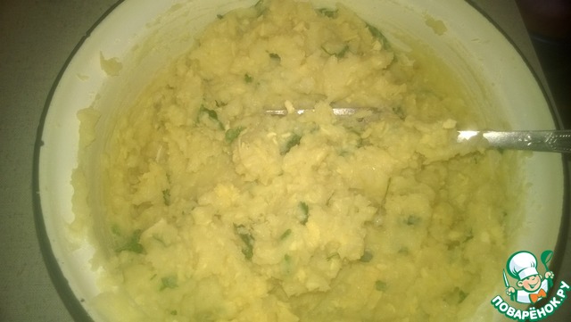 Берем вчерашнее пюре, хорошенько разминаем его вилкой, т. к. со временем оно твердеет. Добавляем яйца, хорошенько перемешиваем. Нарезаем зелень, солим, перчим на ваш вкус. Также добавляем сыр, тертый на терке.
