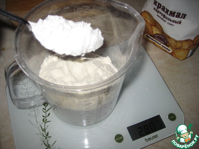 Для теста смешайте 280г муки с 2ст. л крахмала и 0,5ч. л. соли.