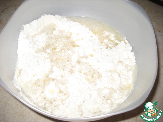 Влейте воду с маслом в муку.