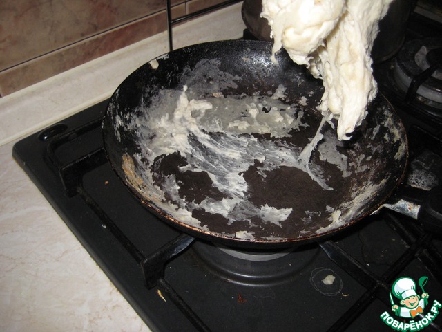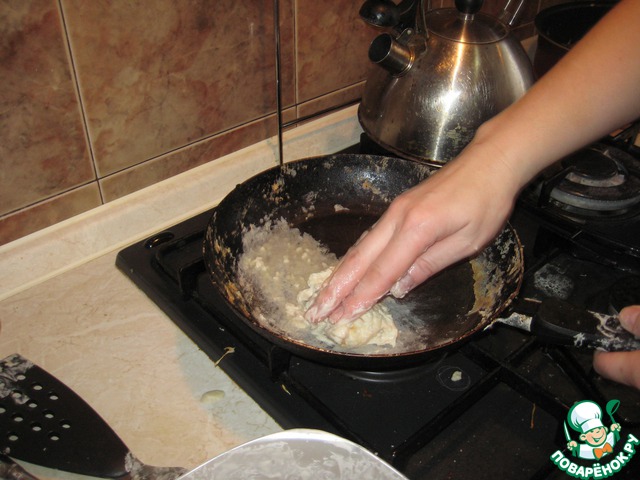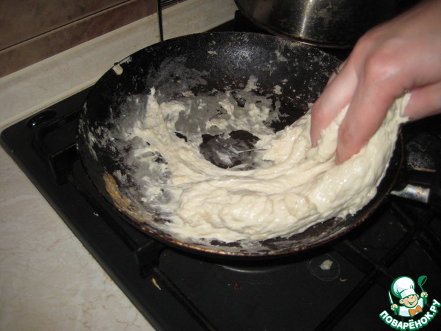 Во-вторых, мое тесто было слишком плотным. Я стала его "разжижать" водой. Тесто получилось этакая шмякушка, не одним куском, как бы густая жижа сметаны. После этого я брала в руку немного жижечки и намазывала вручную сковородку.