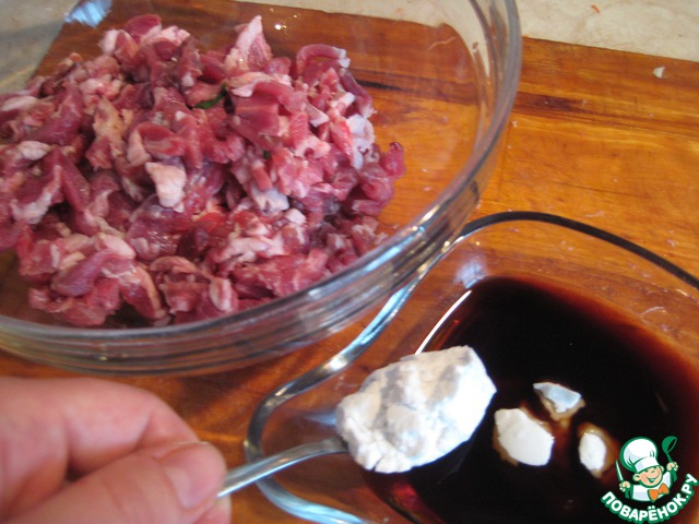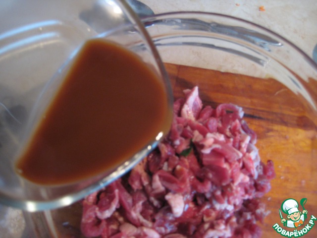 Перемешать соевую заливку с мясом, отставить. Пока мяско пропитывается ароматами, продолжим творить начинку.