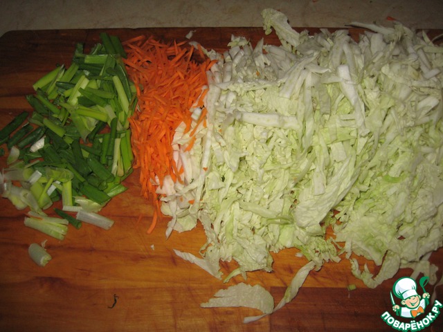 Очень тонко нарезать листья пекинской капустки, удалив нижнюю, самую жесткую часть. Морковку я (не мудрствуя лукаво) натерла на средней терке для корейской моркови. Зеленый лук нарезать на кусочки примерно по 2 см.