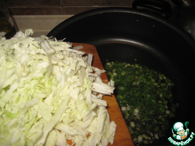 Часть лучка бросить на горячую сковородку, где уже нагрелось растительное масло. Через пару минут к нему добавляем капусту, морковь. Еще через 2-3 минуты - оставшийся лук.