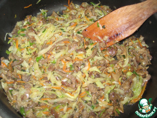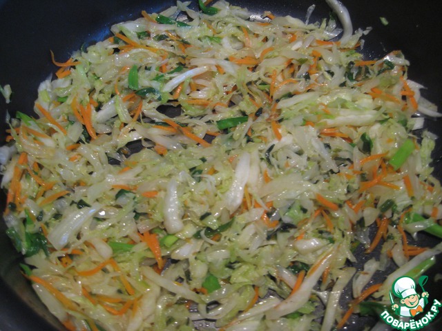 Жарить, пока капуста не повянет. Переложить на тарелку.