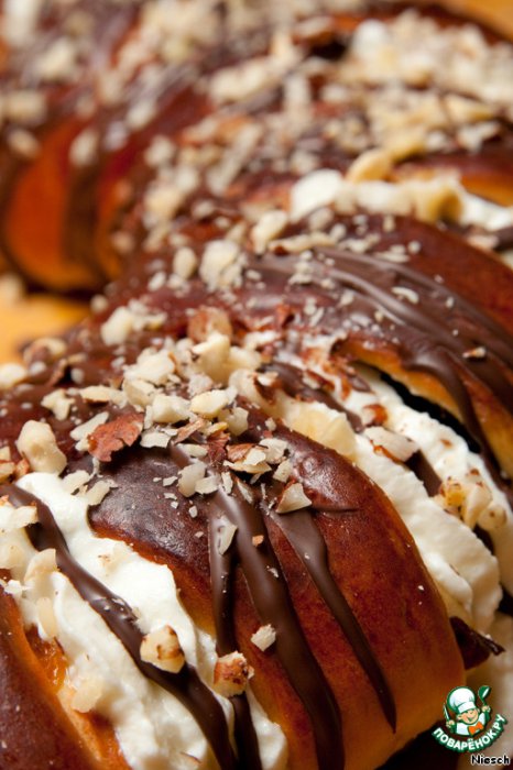 Кремом заполнить разрезы на кренделе (выше картинка поближе, может, понятнее будет, надеюсь). Крендель обсыпать орешками и полить растопленным шоколадом.