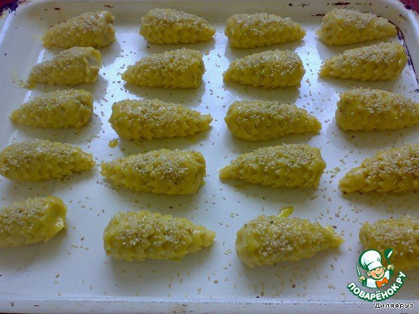 Переложить на противень, смазать желтком, украсить посыпав белым кунжутом.