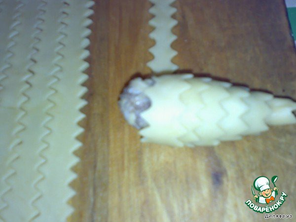 Тесто раскатать в тонкий пласт на 2 мм., резать в полоску толщиной 2 - 3 см.