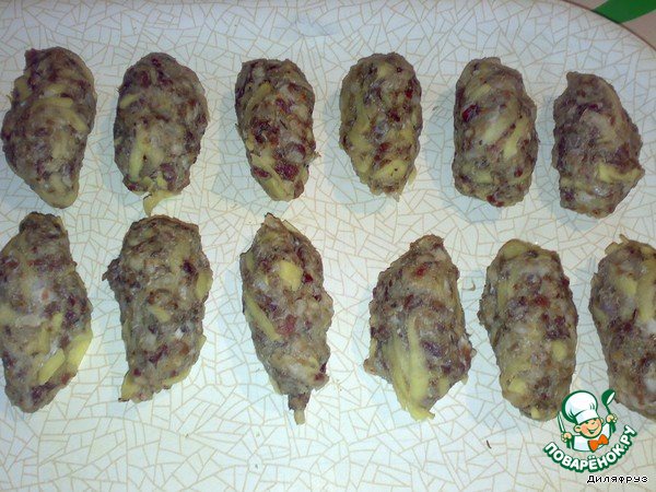 Поделить фарш на 25 - 30 частей и сделать овальными.