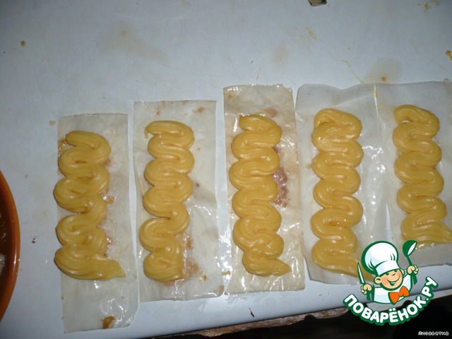3 )Растительное масло поставить греться. Тесто выложить в кондитерский мешок. Из пергамента вырезать полоски примерно 10 на 3 см, смазать их растительным маслом и выдавить из кондитерского мешка небольшие палочки-пончики на пергамент.