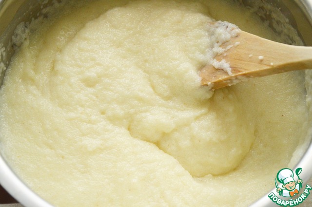 2. Тонкой струйкой влить горячее молоко и варить на медленном огне густую манную кашу. Снять с огня. остудить.