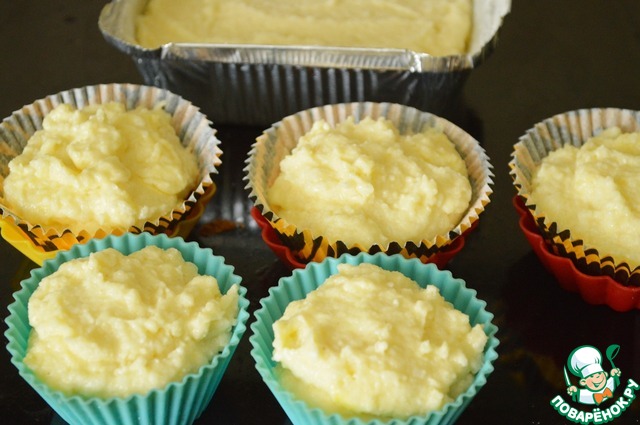 5. Формы смазать маслом и присыпать мукой. Полученное тесто выложить в формы.