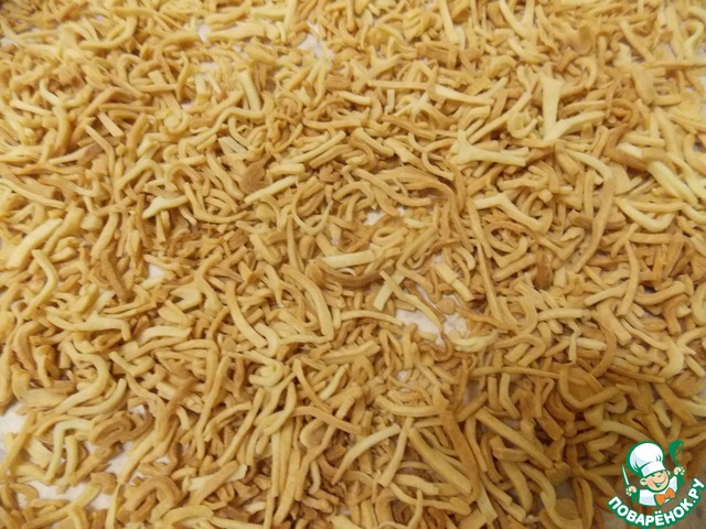Раскатайте очень тонко. У меня просвечивал стол через тесто. Припорошить тесто мукой, скатать его в рулет и тонко нарезать в соломку. На противень положить бумагу для выпечки, а на нее соломку. Поставить в духовку при t=160 и поджарить до золотистого цвета. Вынуть и дать остыть.