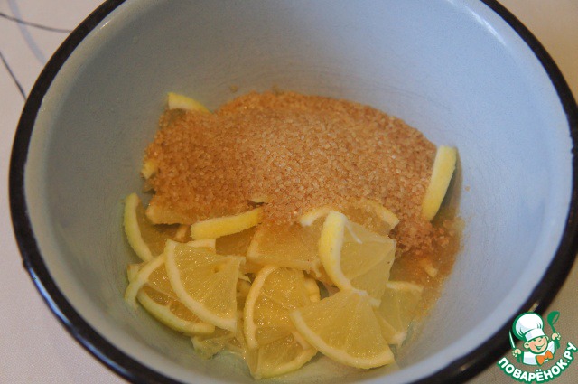 А сам лимон порезать на тонкие ломтики, затем на четвертинки, удалить косточки и засыпать 100 г сахара.