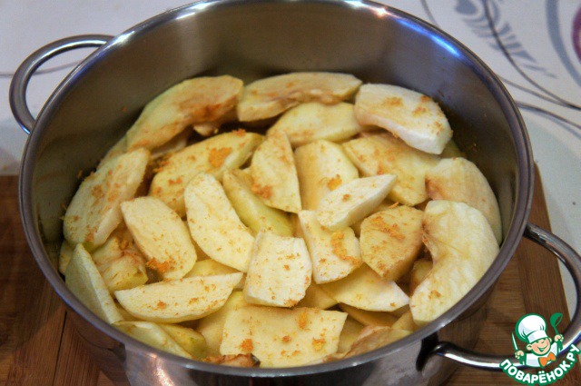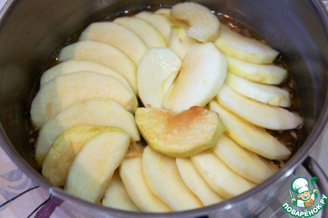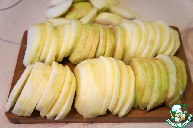 Яблоки очистить и нарезать тонкими ломтиками.