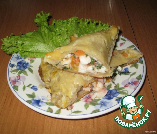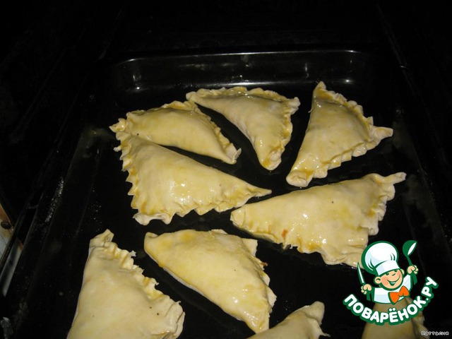 Сложить их в виде треугольников и защипить края. Смазать верх изделия желтком. Выпекать в духовке в течении 15 минут