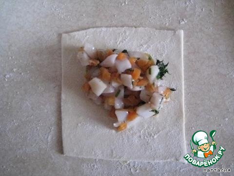Тесто раскатать в тонкий пласт, а затем порезать на квадраты. Выложить начинку на квадраты теста.
