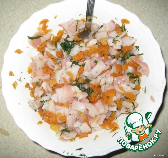Морковь очистить и нарезать кубиками, а затем добавить в кальмары. Туда же поместить рубленую зелень укропа, соль, черный перец.
