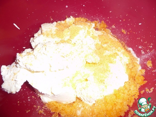 Добавить сахар и взбить. Далее добавить сметану, рикотту, цедру, ванильный сахар - все взбить.