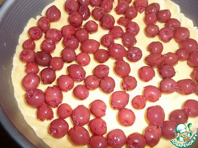 Вишню выложить на сито, дать стечь соку. Выложить на тесто.