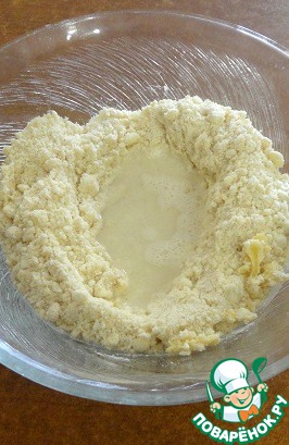 Просеять кукурузную и пшеничную муку в миску. Добавить разрыхлитель, фету и растопленное масло, перемешать руками, чтобы смесь напоминала крошки.