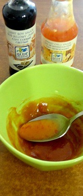 В это время куриное филе нарезать маленькими кусочками и замариновать в соевом соусе и соусе чили-манго, с добавлением мускатного ореха.