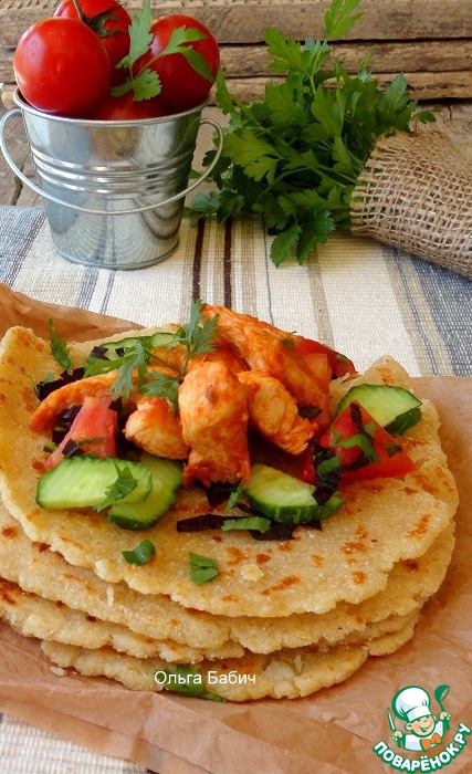 Кукурузно-сырные лепешки с куриным филе и овощами