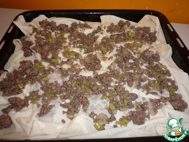 После немного охладить. Противень протереть растительным маслом. Тесто положить на противень, немного смазать молоком. Выложить часть начинки.