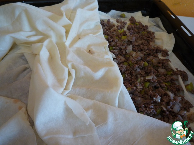 Закрыть вторым слоем теста. Затем снова начинку, и снова тесто.