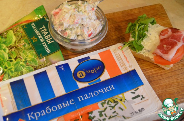 Готовим творожный дип. В отдельной мисочке смешайте творог, нарезанные (или натертые на терке) крабовые палочки, зелень и сухие приправы с солью. Эту смесь можно измельчить блендером, а также по желанию в нее можно добавить немного чеснока.