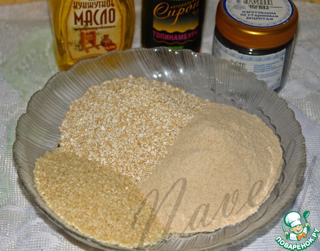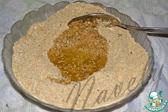 Перемешиваем сухие ингредиенты. Отдельно в 80 мл. воды добавляем кунжутное масло и сироп топинамбура или мед (кленовый сироп)
