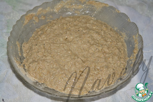 Должно получиться вот такое, липкое тесто, не слишком крутое, но и не жидкое. Накрываем его пленкой и оставляем примерно на 1 час, отдохнуть. За это время отруби набухнут, и тесто станет более густым.