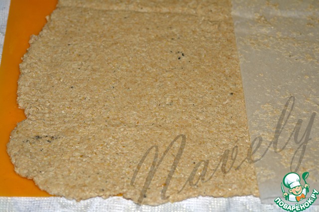 Раскатываем тесто через бумагу до толщины 3-4 мм, если хотите более хрустящие хлебцы, можно раскатать до 1-2 мм.