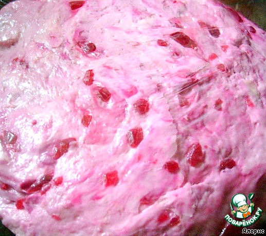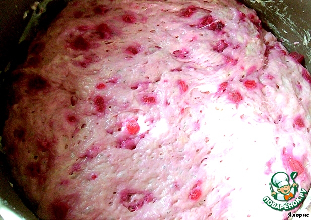 Ввводим, постоянно перемешивая, в сухую смесь растительное масло и газированную воду. Добавляем свеклу. Накрываем емкость пищевой пленкой и оставляем тесто подниматься. Оно должно увеличиться в объеме вдвое, происходит это примерно через час, полтора (зависит от температуры в помещении). Подошедшее тесто обиваем...