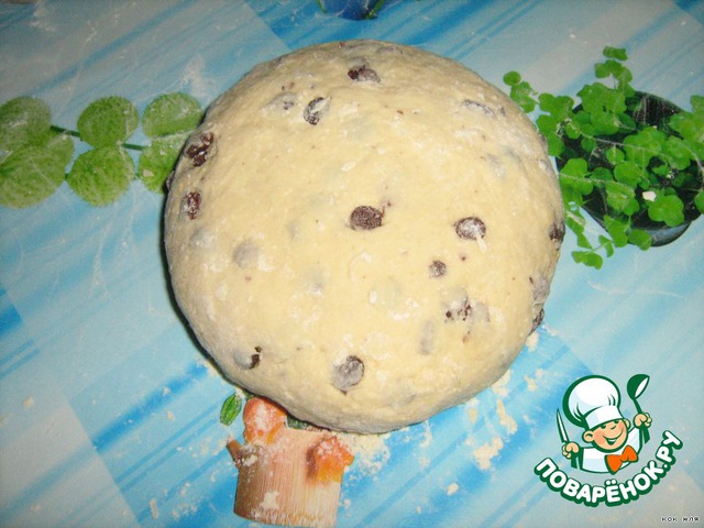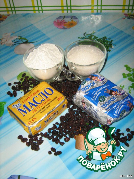 Замешиваем тесто - творог, сахар, масло, изюм, яйцо, мука.