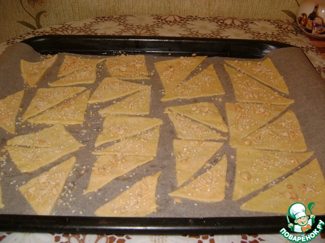 На противень, застеленный бумагой для выпечки, выкладываем наши треугольники, смазываем их белком, посыпаем орехово-кунжутной смесью. Отправляем в духовку, разогретую до 180 градусов, на 15 минут. Выпекаем до золотистого цвета.