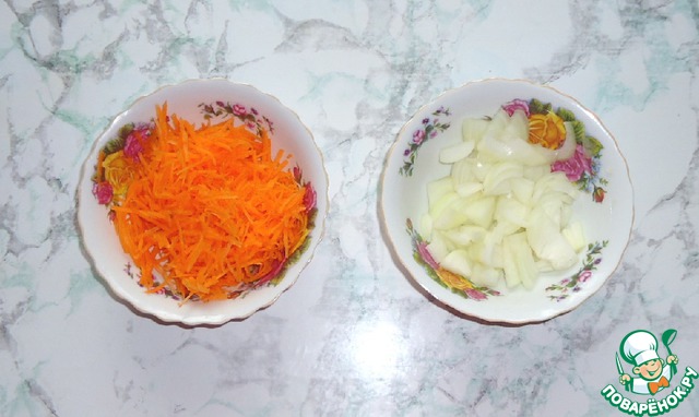 Морковь натереть на средней тёрке, лук мелко нарезать.