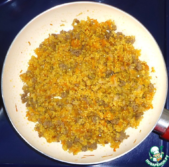Пшено промыть, добавить к овощам и фаршу, добавить воду и соль. Накрыть крышкой и тушить на медленном огне до готовности.