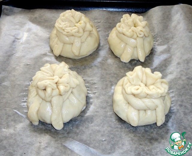 Противень застелить бумагой для выпечки, смазать растительным маслом и выложить мешочки. Поверхность мешочков смазать яичным белком или растительным маслом. Выпекать при температуре 170-180 градусов 30 минут.